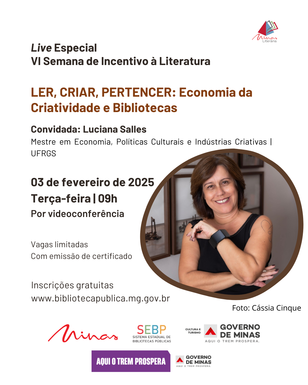 O tema da edição 2026 é “Ler, Criar, Pertencer” No dia 3 de fevereiro, às 9h, será realizada uma live especial de formação e inspiração para as equipes das bibliotecas públicas e comunitárias que participarão da VI Semana Estadual de Incentivo à Literatura (SEIL). A atividade tem como objetivo apresentar e aprofundar o tema da edição 2026: “Ler, Criar, Pertencer”, em diálogo com o eixo estratégico definido pela Secult-MG para o ano: a Economia da Criatividade. A convidada da live é a gestora cultural Luciana Salles, profissional dedicada a políticas públicas de cultura, economia criativa e articulação territorial. Com quase 30 anos de atuação no setor, Luciana é Mestre em Economia, Políticas Culturais e Indústrias Criativas pela UFRGS, pós-graduada em Planejamento e Gestão Cultural e…