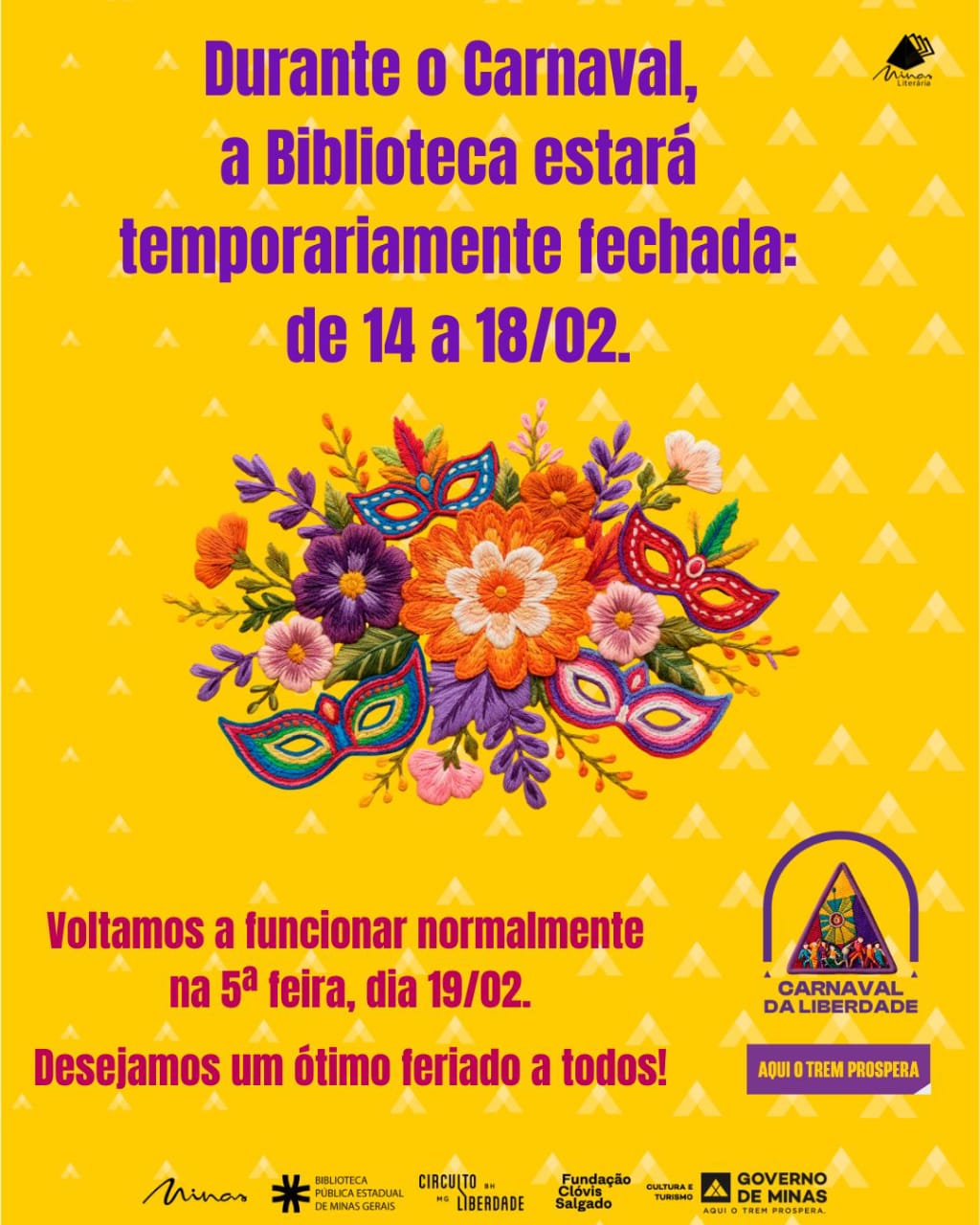Aviso Importante – Alteração no horário de funcionamento Em razão dos desfiles dos blocos de Carnaval no Centro de Belo Horizonte, a Biblioteca terá alterações no horário de atendimento nos dias: 🗓 11/02 (quarta-feira) – funcionamento até 16h🗓 12/02 (quinta-feira) – funcionamento até 16h🗓 13/02 (sexta-feira) – funcionamento até 16h 🎭 Durante todo o período de Carnaval, a Biblioteca permanecerá fechada, retomando suas atividades normalmente na quinta-feira, 19/02. Contamos com a compreensão de todos e desejamos um Carnaval alegre e seguro!