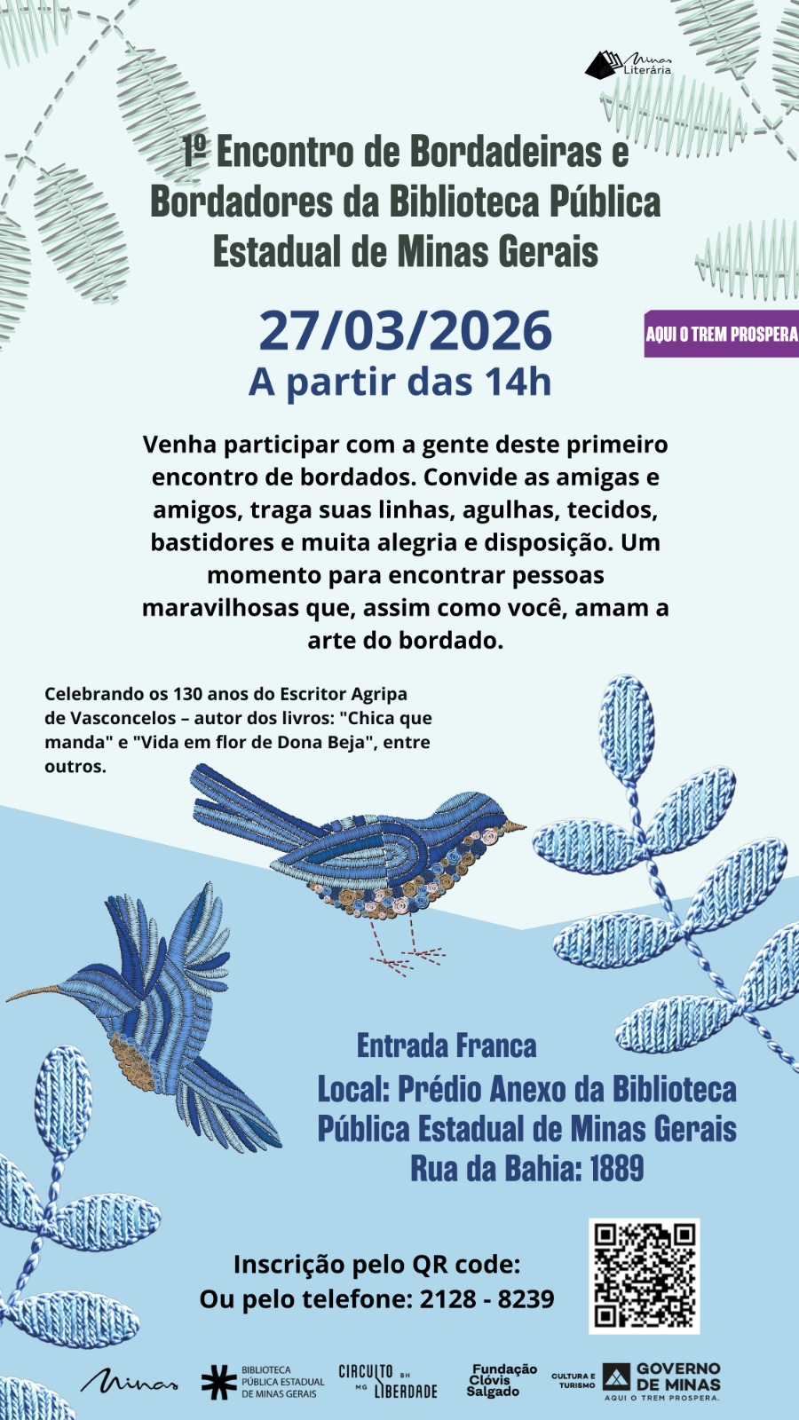 A Biblioteca Pública Estadual de Minas Gerais realiza o 1º Encontro de Bordadeiras e Bordadores, celebrando também os 130 anos do escritor Agripa de Vasconcelos, autor de obras como Chica que Manda e Vida em Flor de Dona Beja.