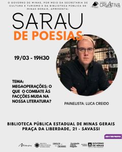 Após o painel com o escritor Luca Creido, que propõe a reflexão “Megaoperações: o que o combate às facções muda na nossa literatura?”, a noite segue com uma homenagem ao Psiu Poético – 40 anos de poesia e resistência.